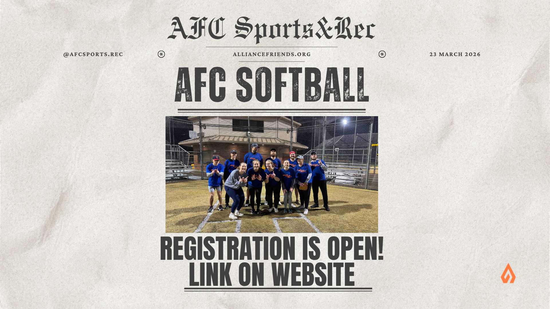 Join us for AFC Softball! Starting Friday May 29th at Silver Park for those 18 and over! Click HERE to register!